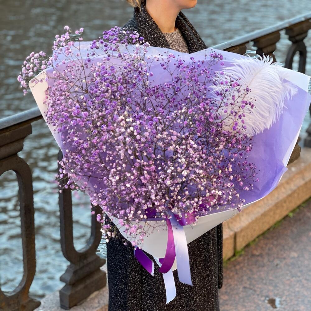 Гипсофила – 7 шт.перо декоративное – 2 шт.Упаковка дизайнерская – 1 шт.ленты атласные – 4 шт.