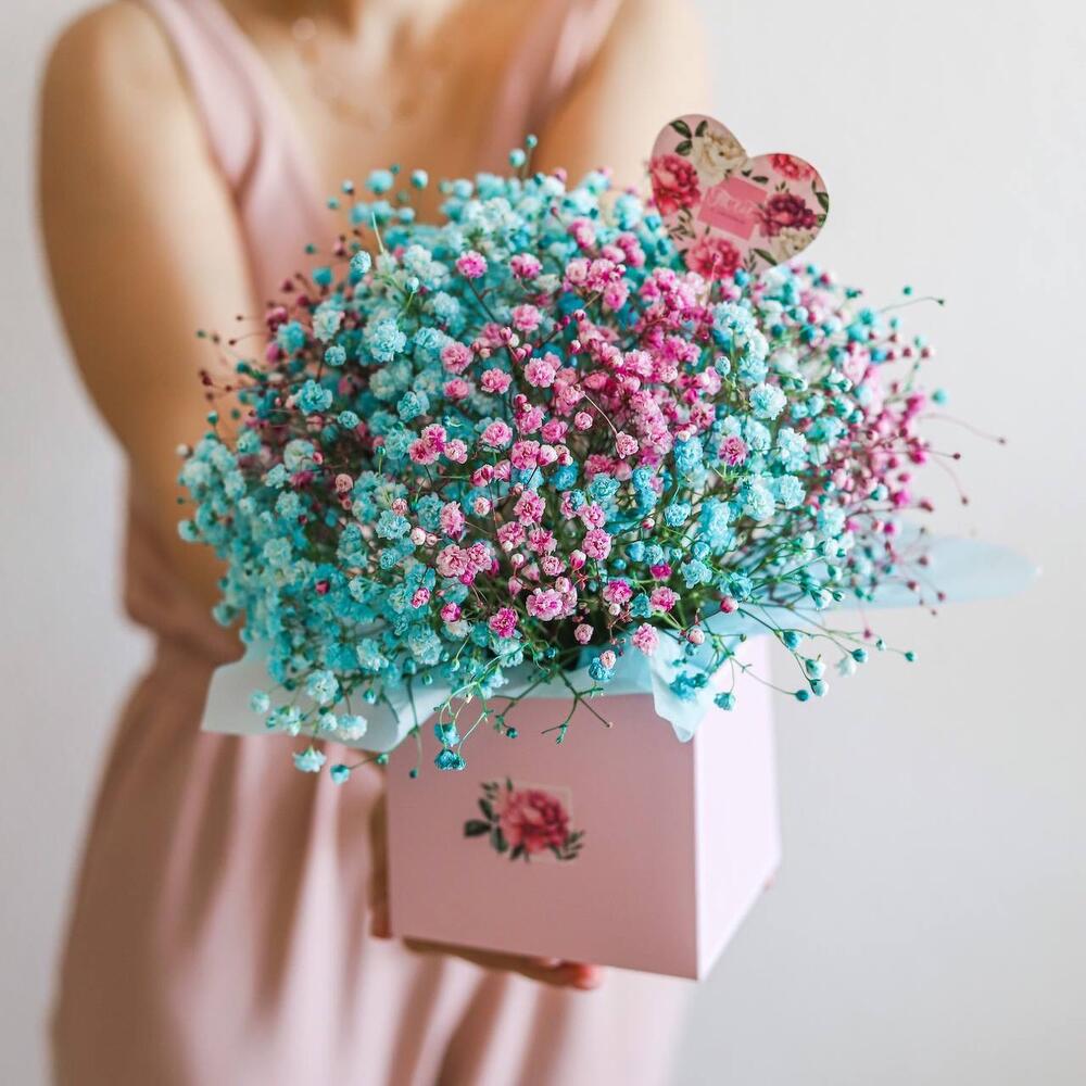 гипсофила цветная – 5 шт.Коробка квадратная – 1 шт.Топпер – 1 шт.Оазис флористический – 1 шт.Тишью – 4 шт.коробка транспортировочная – 1 шт.