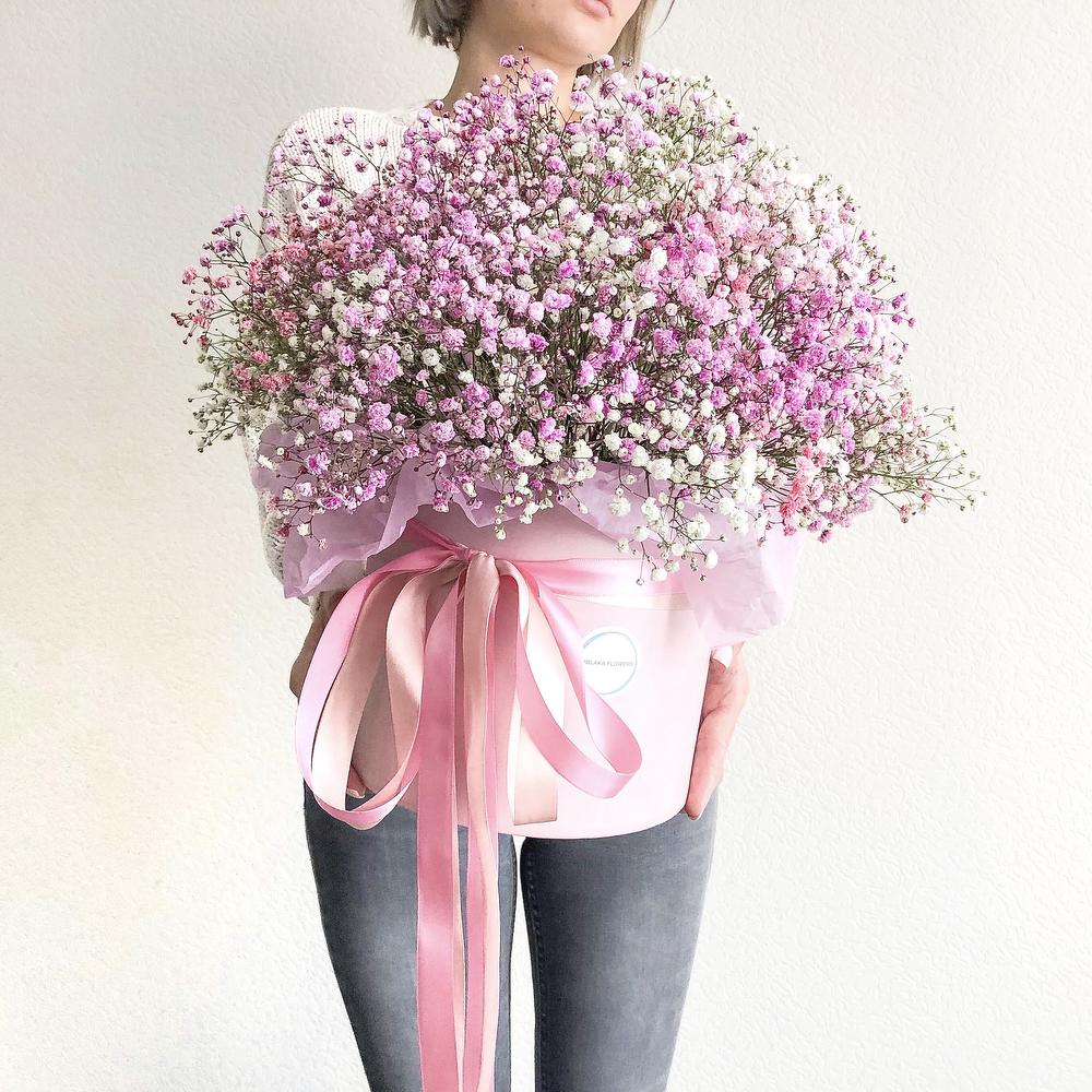 Гипсофила – 13 шт.Коробка шляпная – 1 шт.Оазис флористический – 3 шт.Лента атласная – 2 шт.