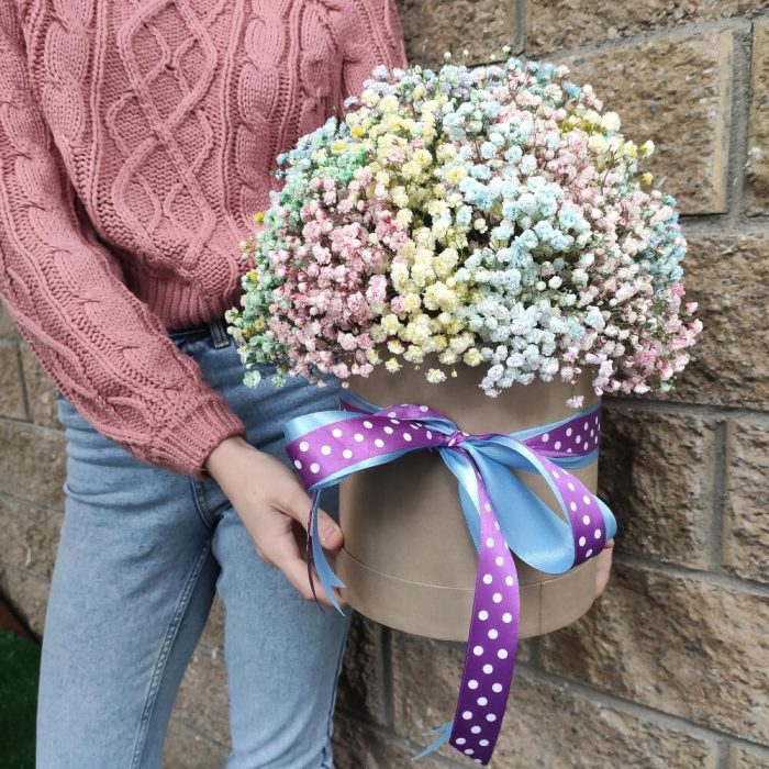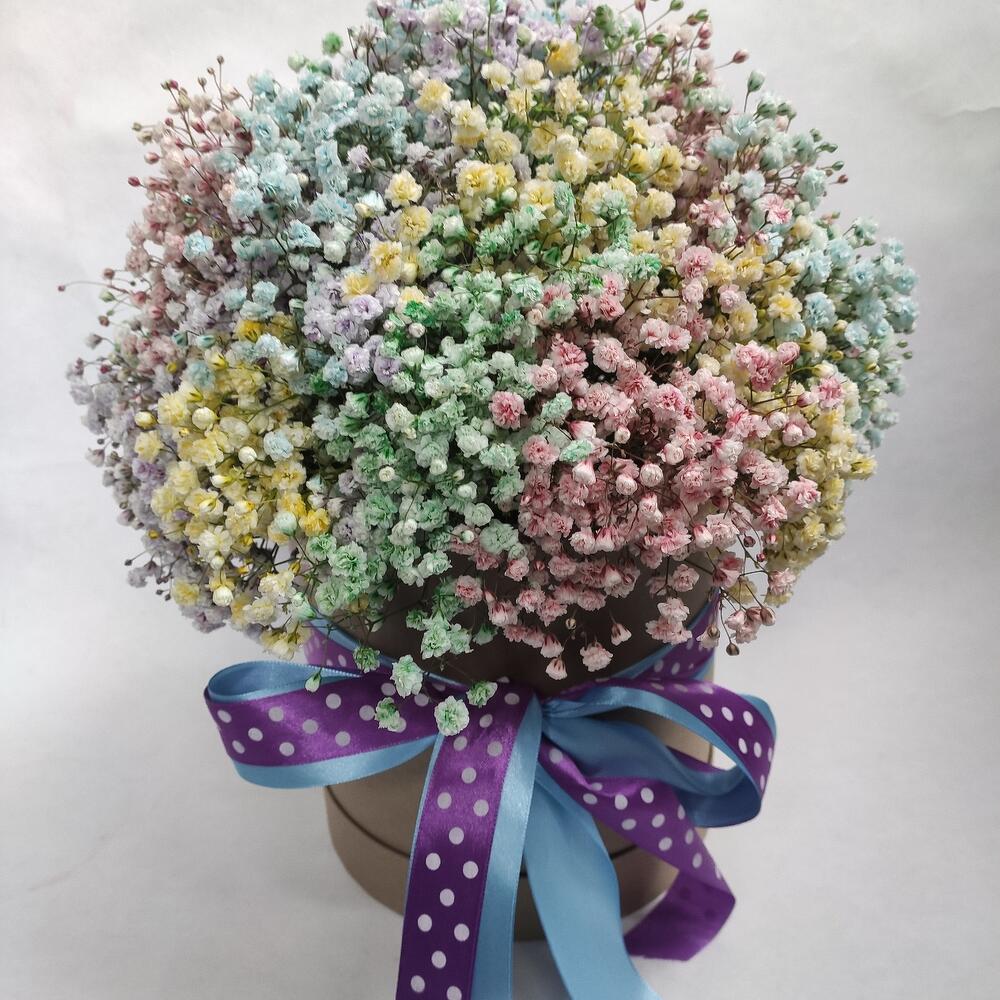 гипсофила микс – 15 шт.Оазис флористический – 1 шт.коробка картонная круглая – 1 шт.