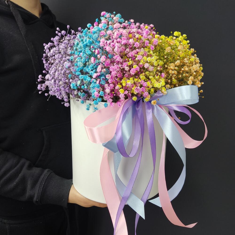 Гипсофила – 9 шт.Лента атласная – 3 шт.Коробка шляпная – 1 шт.