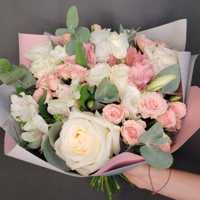 роза канделайт – 3 шт.Роза Мондиаль – 2 шт.Диантус – 4 шт.Альстромерия – 4 шт.Роза кустовая – 3 шт.эвкалипт ветка большая – 2 шт.Упаковка дизайнерская – 2 шт.