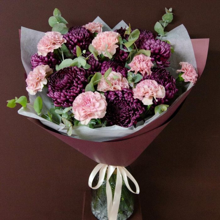 хризантема бигуди – 10 шт. Гвоздика – 9 шт. Эвкалипт – 2 шт. Оформление – 1 шт.
