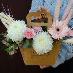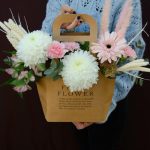 Сумка – 1 шт. Оазис – 1 шт. Альстромерия – 2 шт. Гвоздика – 3 шт. Хризантема – 1 шт. Скиммия – 1 шт. Гербера – 2 шт. Фисташка – 2 шт.