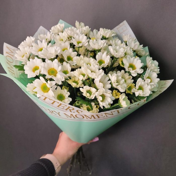 Лента атласная – 1 шт.Упаковка дизайнерская – 1 шт.Хризантема кустовая Сантини – 9 шт.