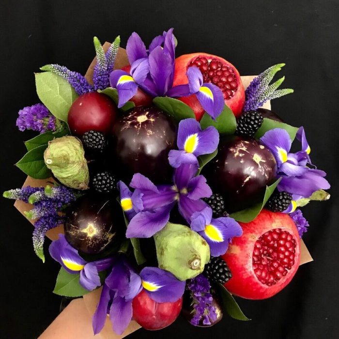 Гранат – 2 шт.баклажаны – 3 шт.Слива – 4 шт.Ежевика – 4 шт.ирисы – 3 шт.Статица – 3 шт.Вероника – 3 шт.лавр или салл – 5 шт.