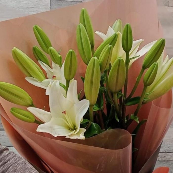 Лента атласная – 2 шт.Упаковка дизайнерская – 2 шт.Лилия Азиатская белая – 5 шт.