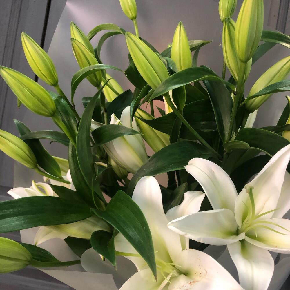 Лилия белая – 5 шт.Упаковка дизайнерская – 2 шт.Лента атласная – 2 шт.