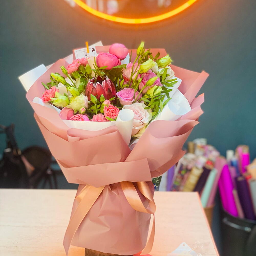 Протея – 1 шт. эустома екстра – 3 шт. спрей сілва пінк – 3 шт. пінк атена – 3 шт. діантус рожевий – 3 шт. фісташка флористична – 3 шт. оформлення букета в упаковка – 1 шт.