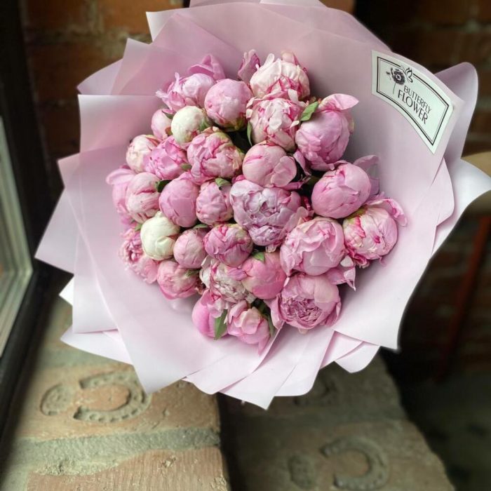 Букет из 29 розовых пионов в дизайнерской упаковке “Рэн Ортанс”