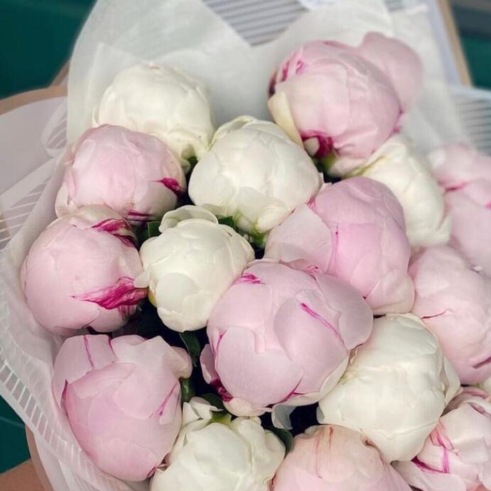 Пион белый – 6 шт.Пион розовый – 9 шт.Упаковка дизайнерская – 2 шт.Лента атласная – 2 шт.Открыточка с вашими пожеланиями – 1 шт.хорошее настроение – 100 шт.инструкция по уходу за цветами – 1 шт.коробка переноска – 1 шт.Кризал – 1 шт.