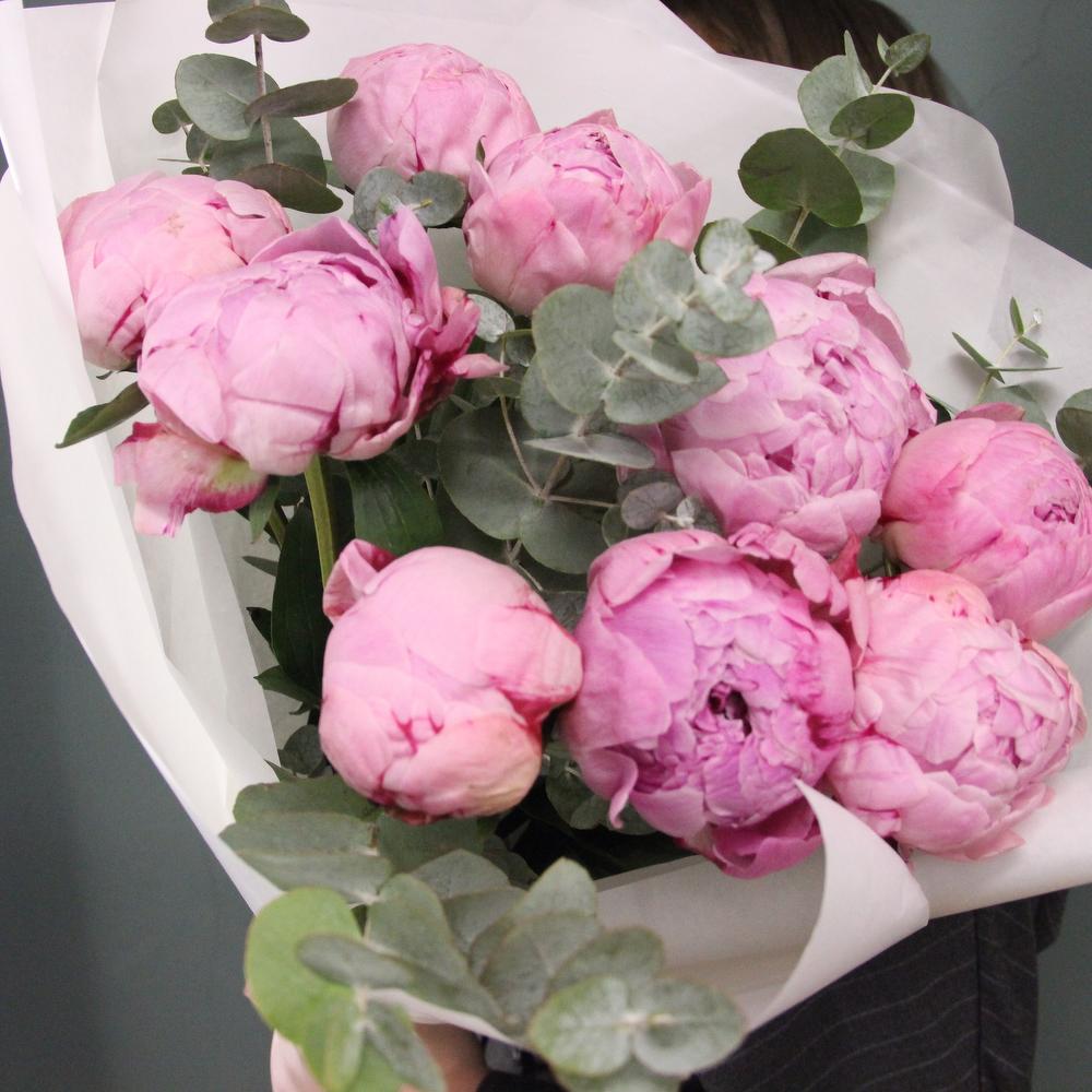 Пион – 9 шт.Эвкалипт – 7 шт.Лента атласная – 2 шт.Бумага – 3 шт.