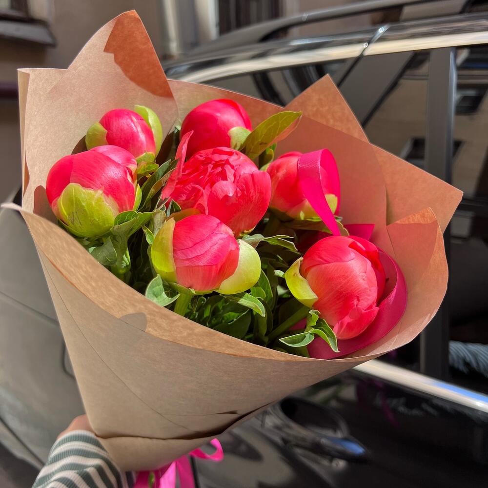Пион Коралл Шарм (Coral Charm) – 7 шт.Лента атласная – 1 шт.Упаковка крафт – 1 шт.