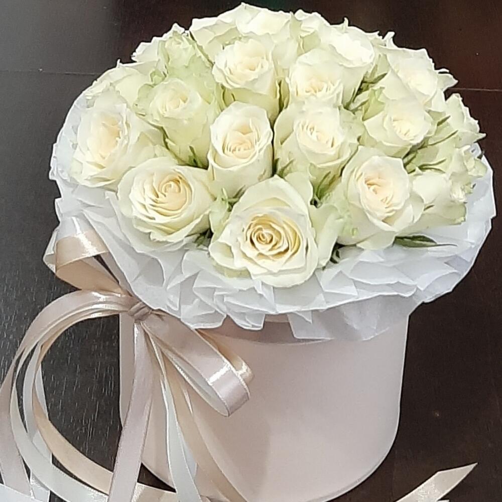 Роза – 25 шт.Шляпная коробка с лентами – 1 шт.Оазис флористический – 1 шт.