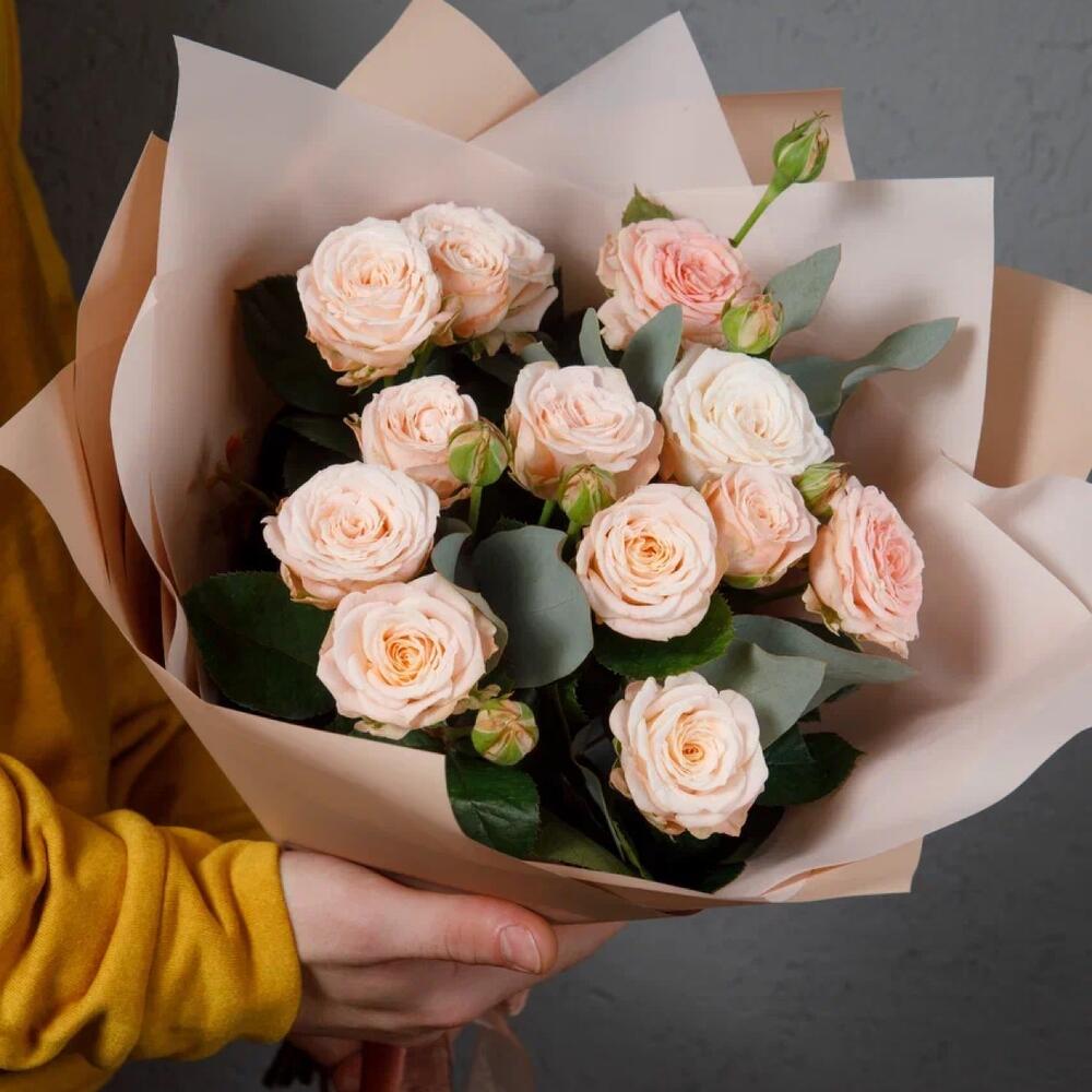 Роза кустовая пионовидная бомбастик – 9 шт. Эвкалипт Микс – 3 шт. Упаковка дизайнерская – 2 шт. Лента атласная – 2 шт. Открыточка с вашими пожеланиями – 1 шт.