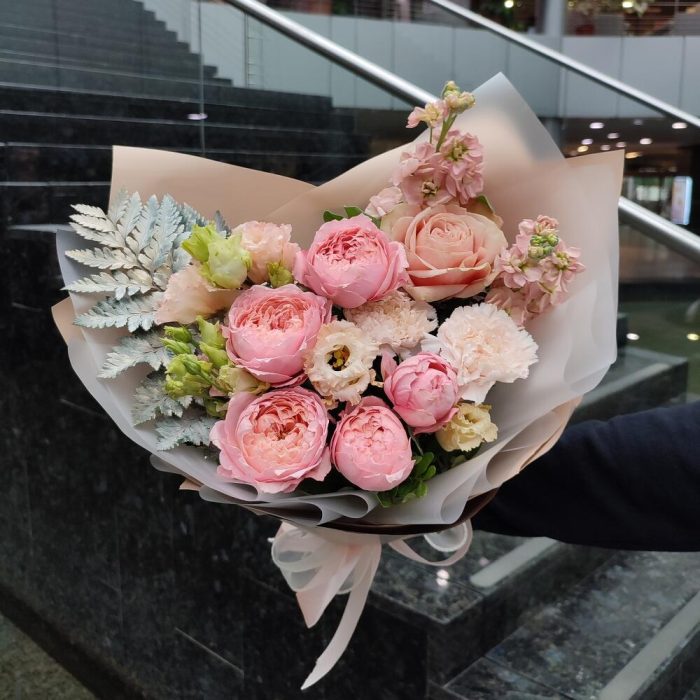 Ахматова Персиковый букет с пионовидной розой матиолой и папоротником
