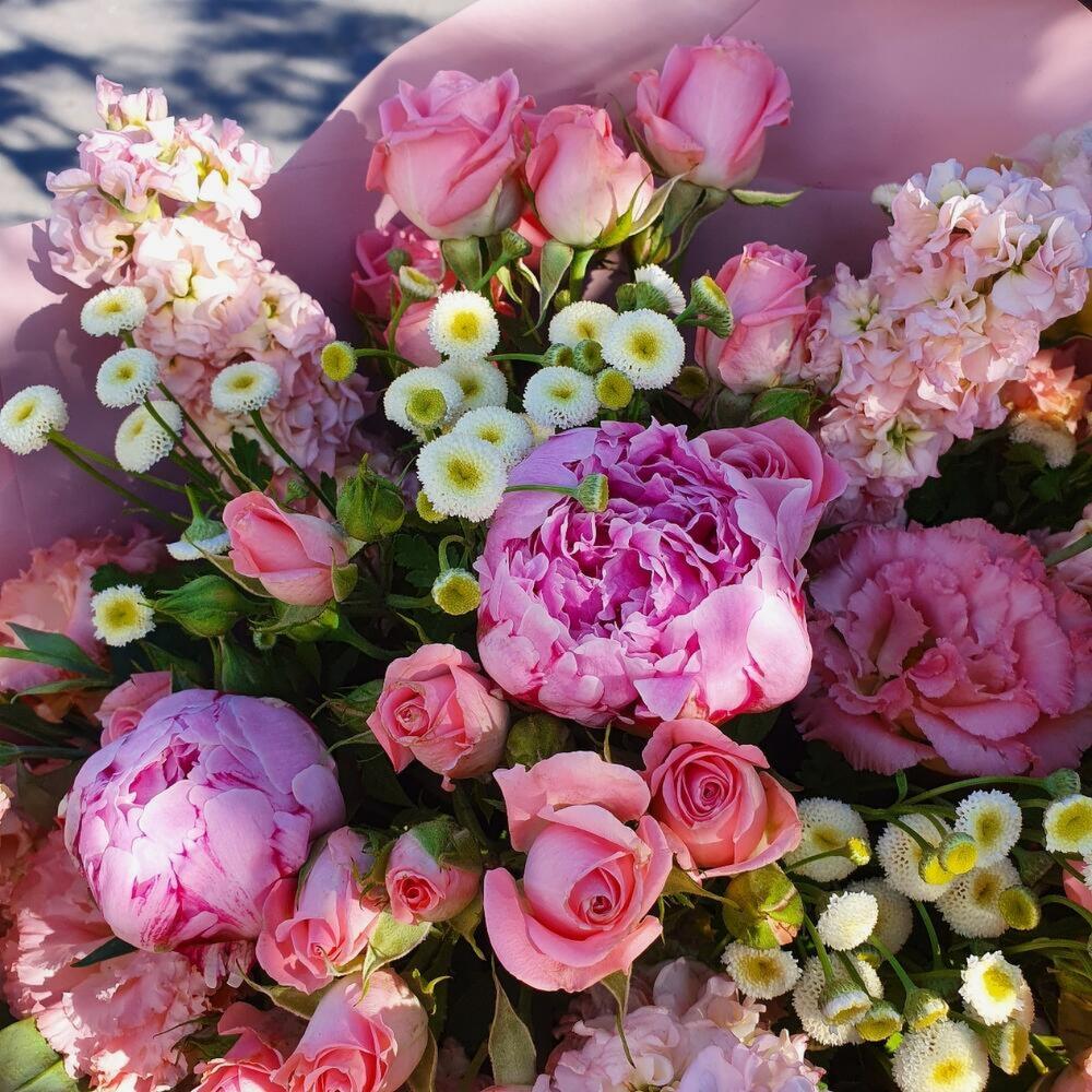 Лизиантус – 7 шт.Пион Сара Бернар – 5 шт.Матрикария – 3 шт.Роза кустовая – 3 шт.Маттиола – 10 шт.Зелень – 1 шт.Упаковка дизайнерская – 2 шт.