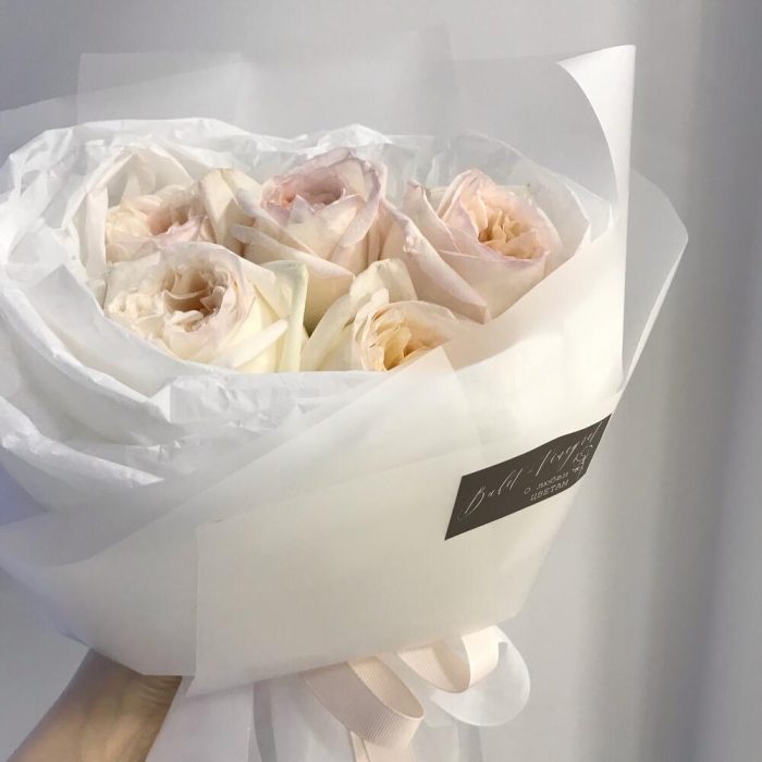 Лента атласная – 2 шт.Тишью – 3 шт.Аквабокс – 1 шт.Средство для продления жизни цветов – 1 шт.Карточка для подписи – 1 шт.Матовая упаковка – 2 шт.роза пионовидная вайт o’hara ароматная – 5 шт.чек лист по уходу за цветами – 1 шт.