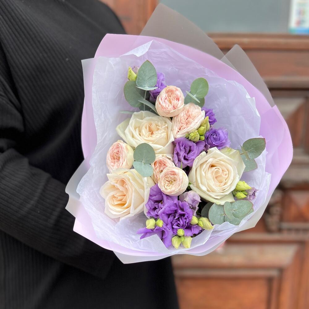 Эвкалипт – 3 шт.Лента атласная – 2 шт.Тишью – 2 шт.Пленка матовая – 3 шт.роза пионовидная вайт o’hara – 3 шт.роза мэнсфилд парк – 1 шт.эустома лавандовая махровая – 2 шт.