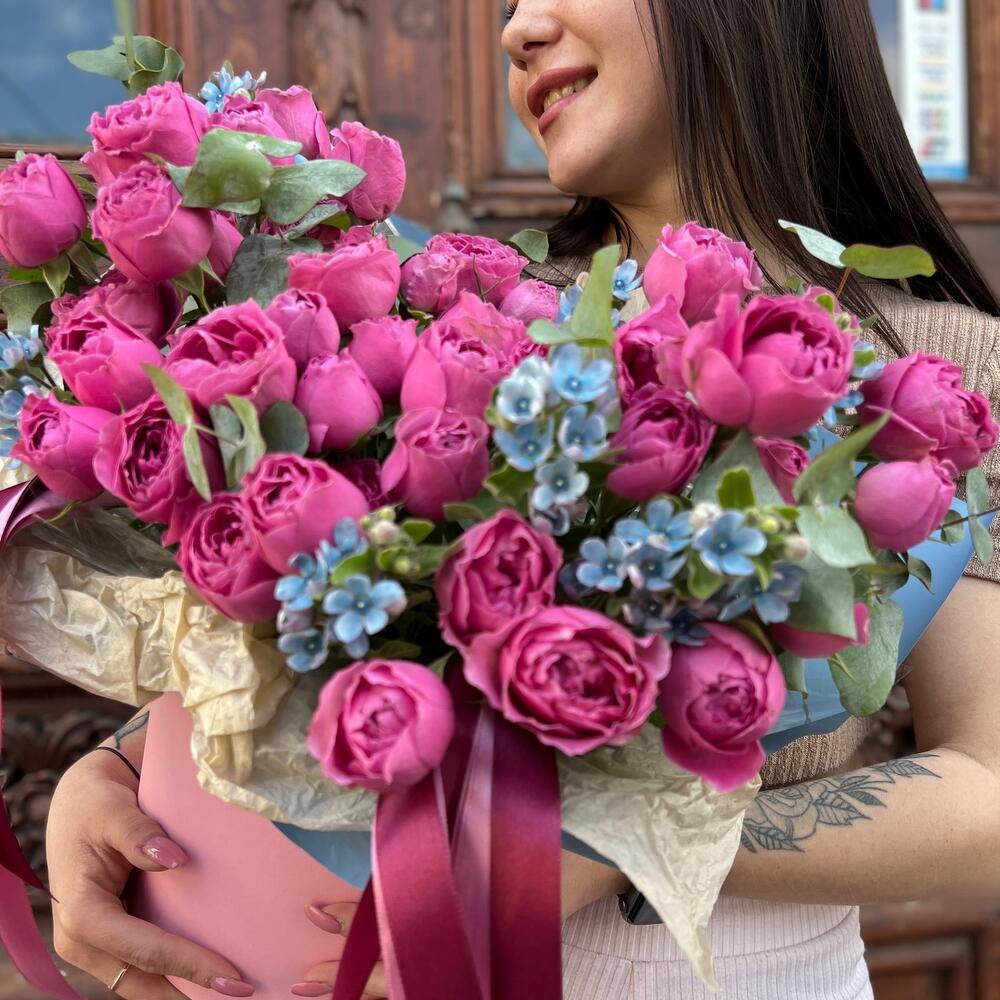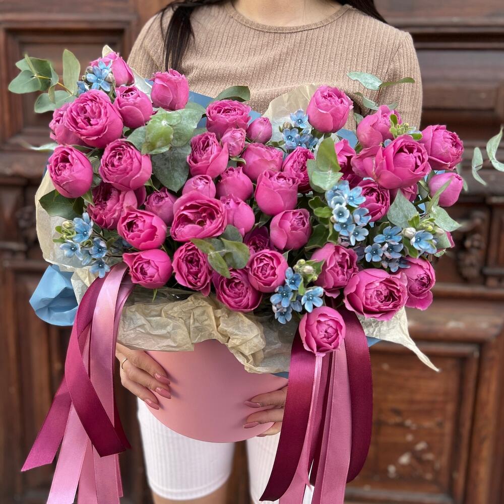 Эвкалипт – 3 шт.Лента атласная – 6 шт.Тишью – 1 шт.Коробка шляпная – 1 шт.Оксипеталум – 7 шт.Пленка матовая – 1 шт.Оазис флористический – 1 шт.роза кустовая мисти бабл – 11 шт.