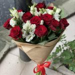 Букет из красных роз и белой эустомы, собранный в круглой форме и оформленный в крафт бумагу.