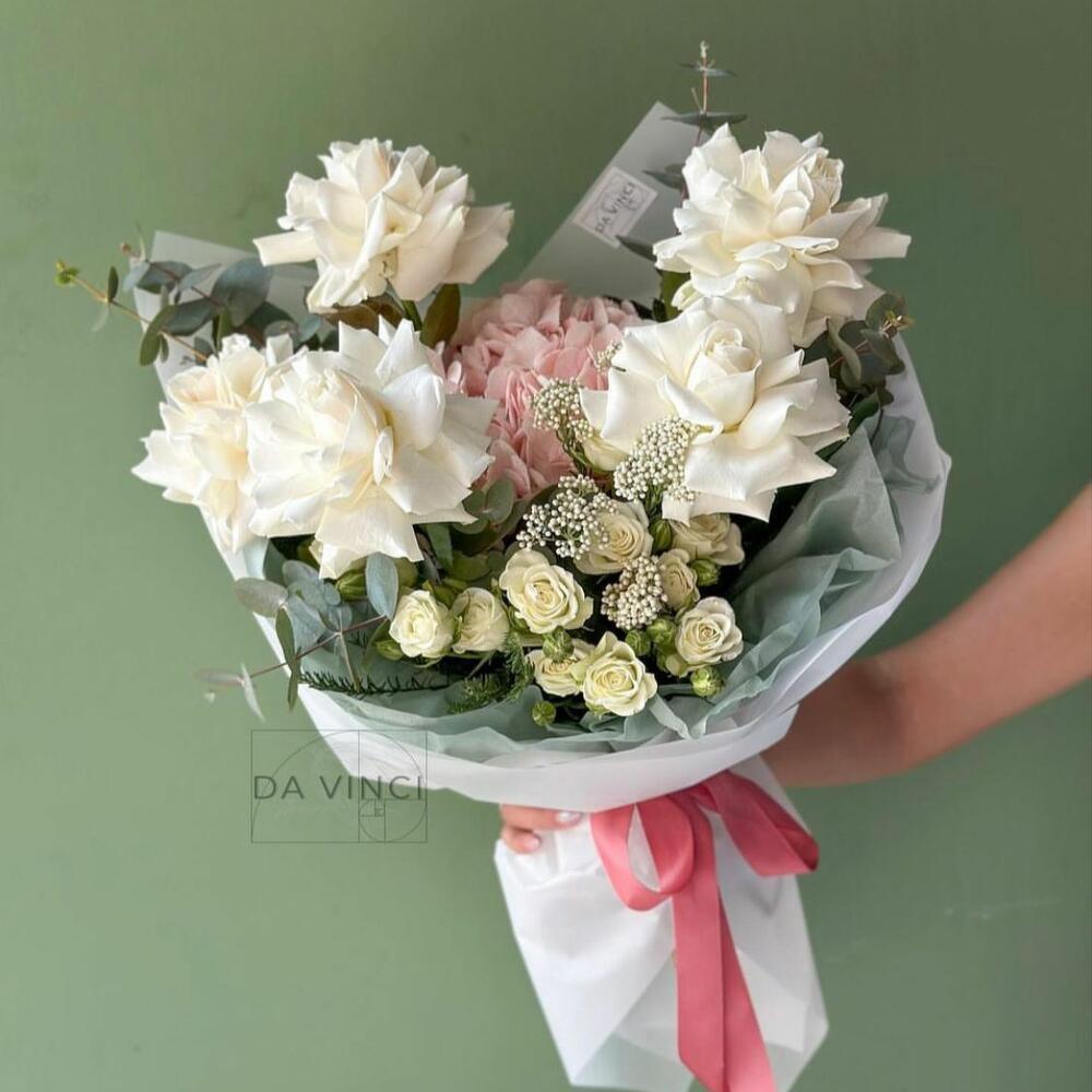 Роза голландская 60 см – 5 шт. Озотамнус – 3 шт. Эвкалипт – 1 шт. Спрей роза – 2 шт. Гортензия – 1 шт.
