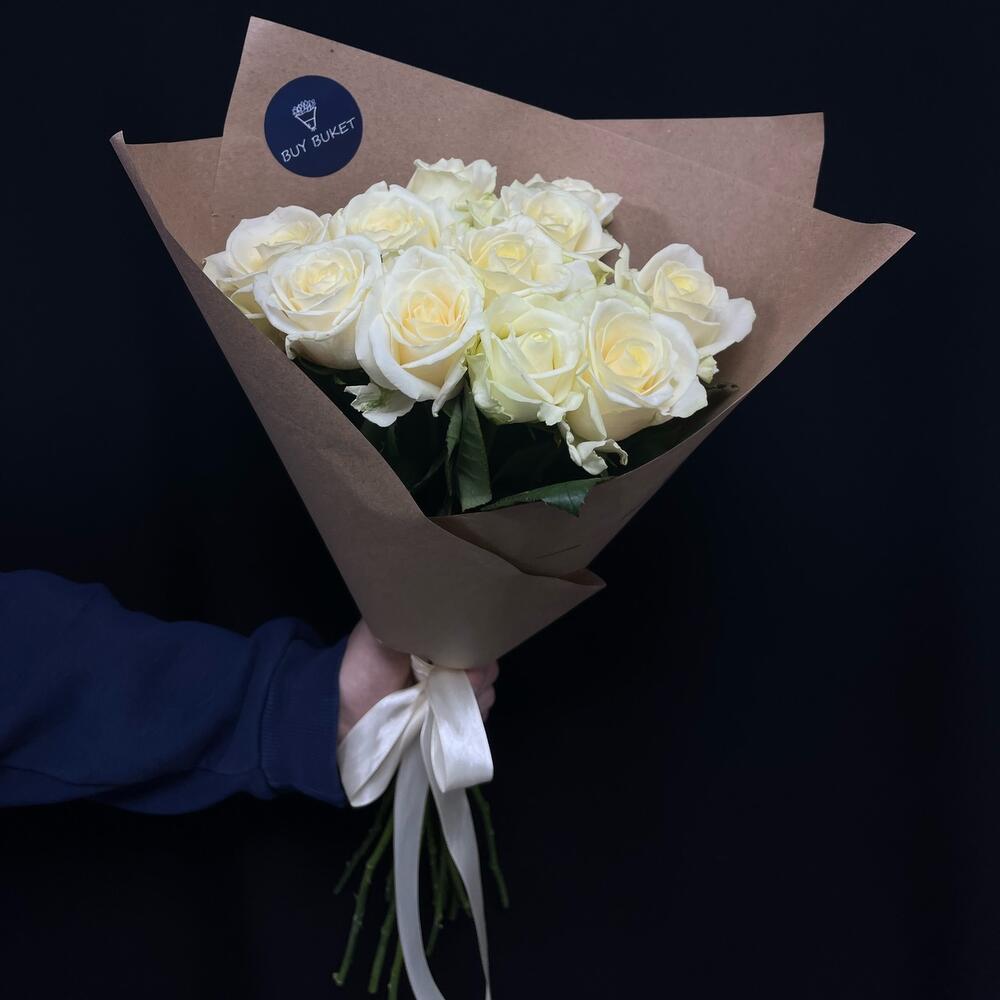белая роза – 11 шт.Крафт бумага – 1 шт.Лента атласная – 1 шт.