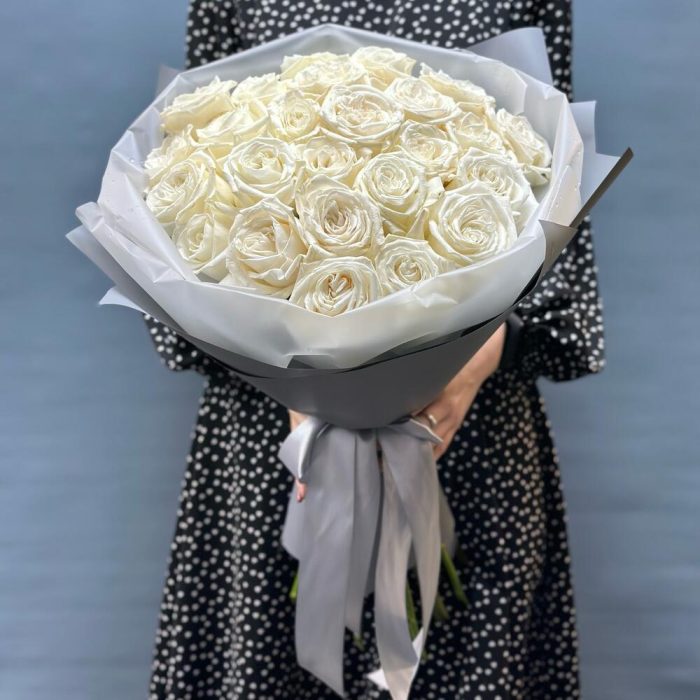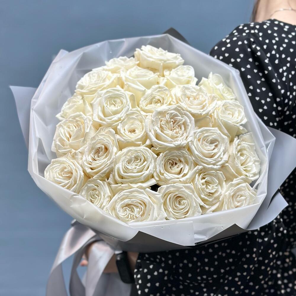 роза пионовидная плая бланка – 25 шт.Тишью белое – 1 шт.Дизайнерская упаковка – 1 шт.Лента атласная – 2 шт.