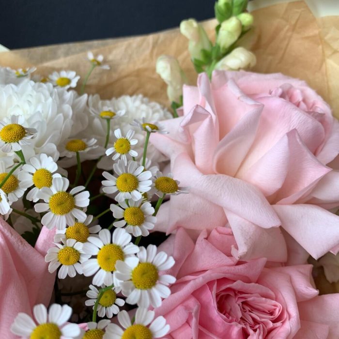 Пионовидная роза – 3 шт.Кустовая пионовидная роза – 1 шт.Кустовая хризантема – 1 шт.Ромашка – 2 шт.антиринум (львиный зев) – 2 шт.декоративная упаковка – 1 шт.Атласная лента – 1 шт.
