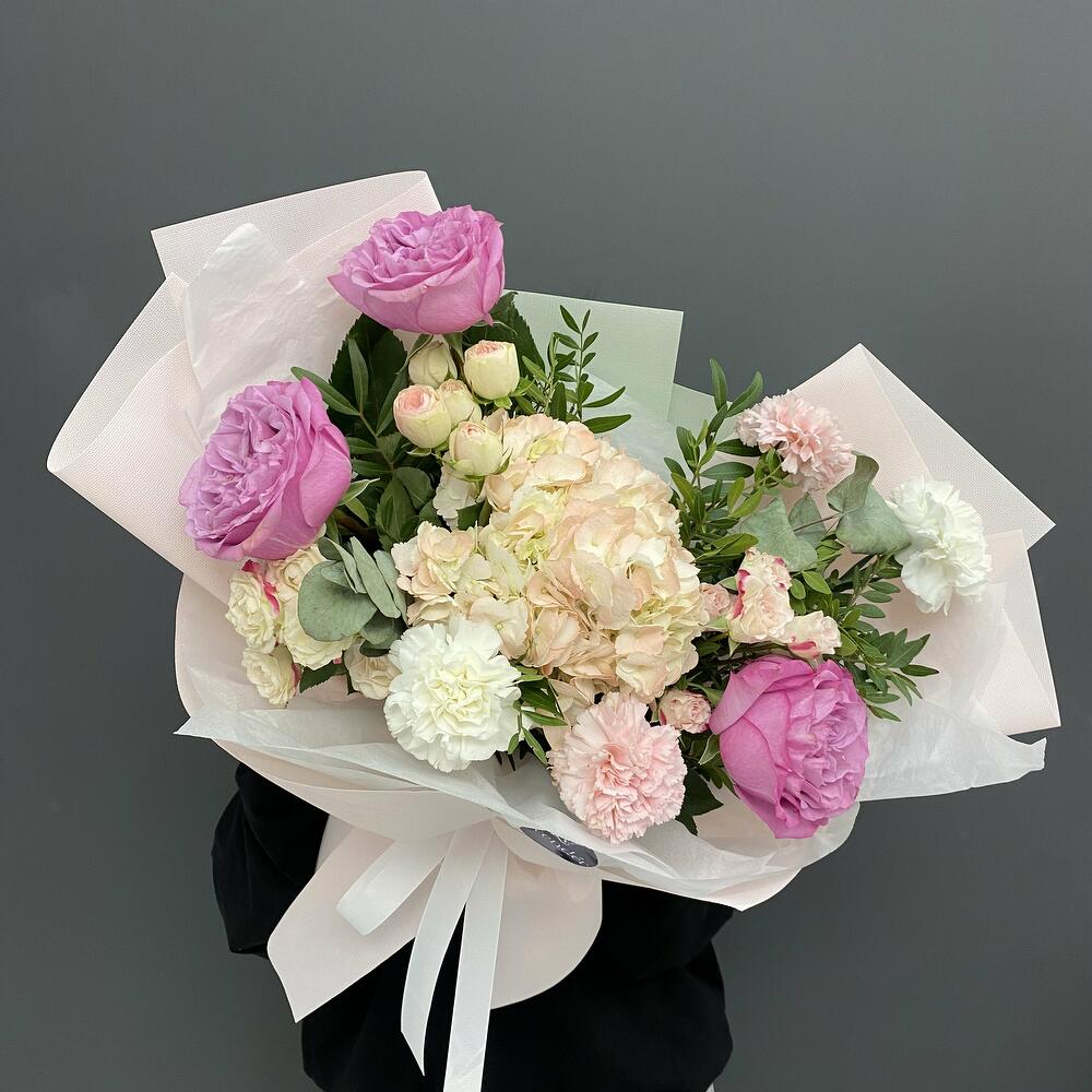 Альстромерии, Гвоздики, Кустовые розы, Лизиантусы, Розы, Хризантемы