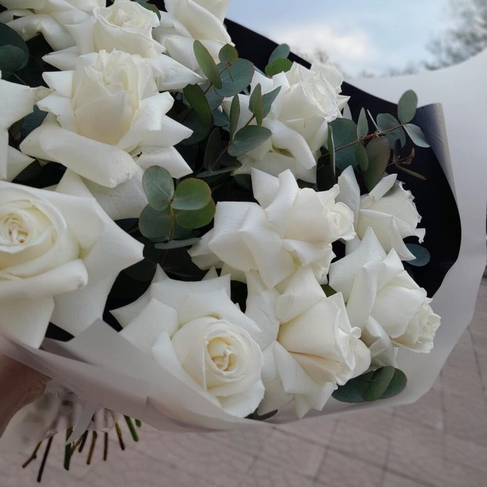 Букет молочных французских роз с пряным эвкалиптом
