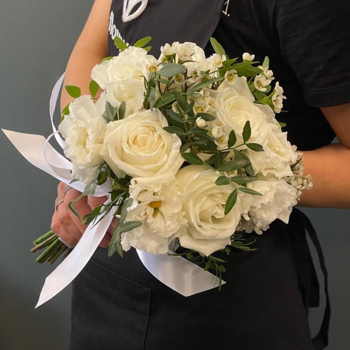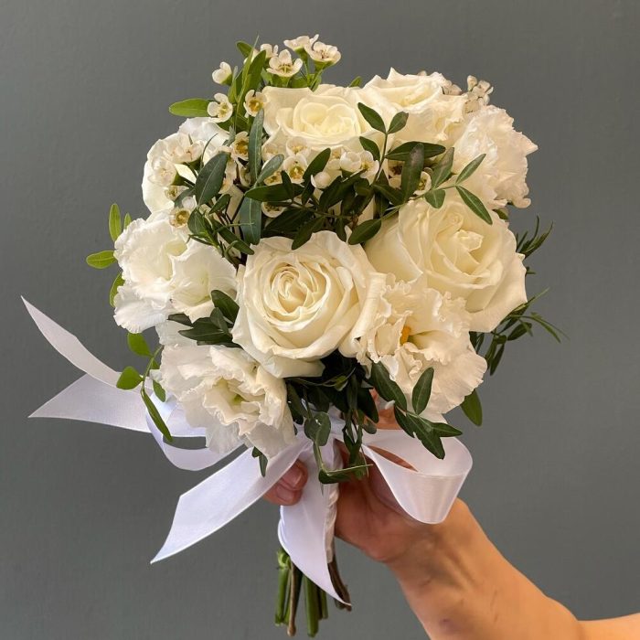 Ваксфлауэр – 1 шт.Лента – 1 шт.Лизиантус – 2 шт.Роза одноголовая – 5 шт.Фисташка – 1 шт.