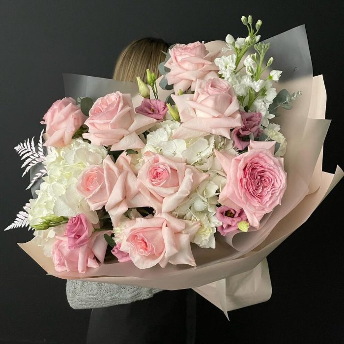 Гортензия – 2 шт.Лизиантус – 2 шт.Маттиола – 2 шт.Папоротник – 2 шт.Роза Эквадор – 9 шт.Диантус – 5 шт.Фисташка – 5 шт.Упаковка дизайнерская – 4 шт.