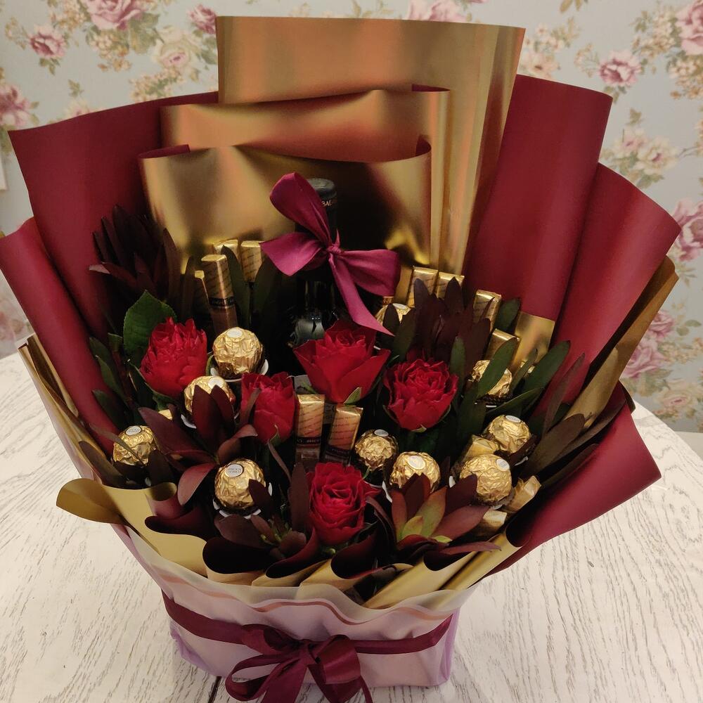 Упаковка дизайнерская – 1 шт.Конфеты Ferrero Rocher – 16 шт.зелень декоративная – 5 шт.розы эквадор (60 см) – 5 шт.конфеты мерси упаковка – 1 шт.