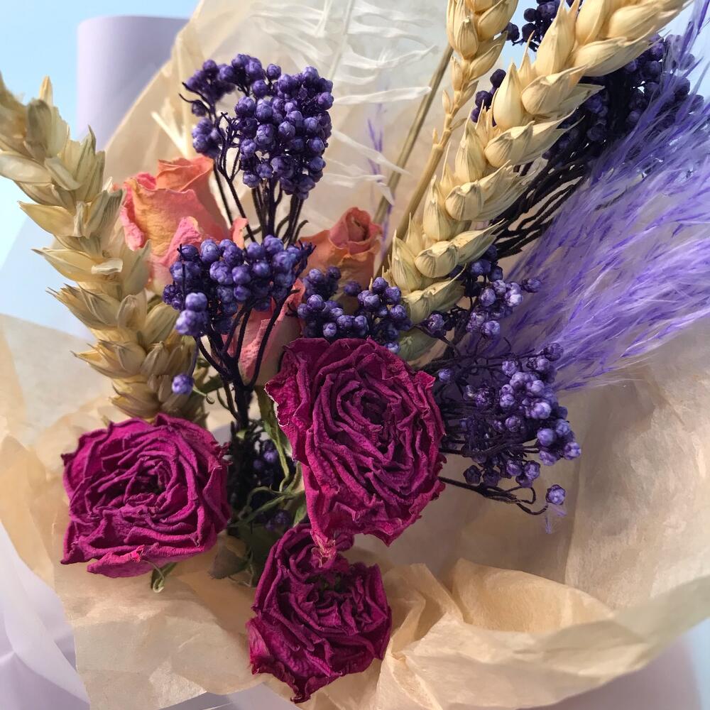 Ковыль – 1 шт.аспарагус стабилизированный – 1 шт.озотамнус стабилизированный – 2 шт.Колосья – 3 шт.роза кустовая засушенная – 2 шт.Оформление – 1 шт.