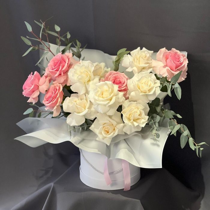 “Атлас☁️” – цветочная композиция с зефиром в деревянном ящике