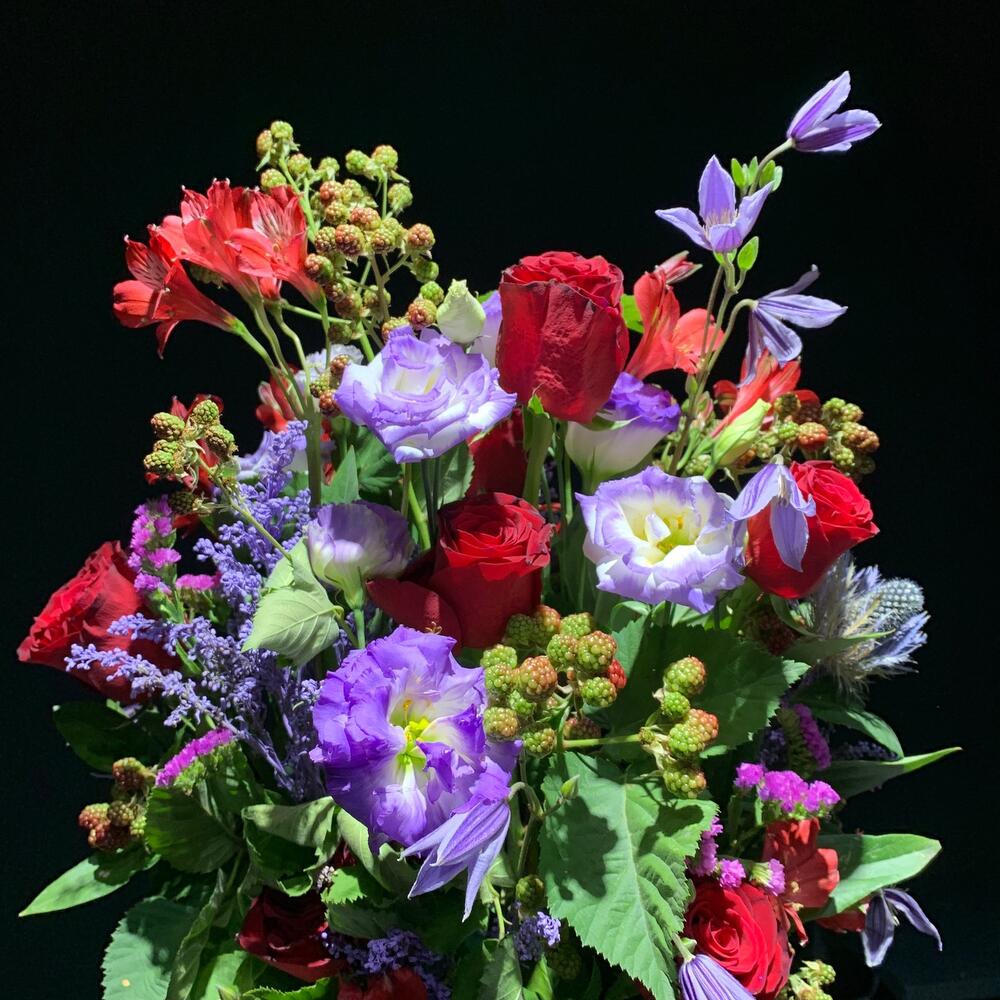 Альстромерия – 3 шт. Статица – 3 шт. Роза – 5 шт. Эустома – 8 шт. Клематис – 5 шт. ветки декоративные – 10 шт.