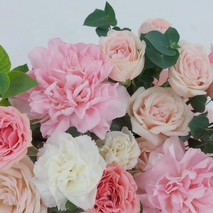 Нежные кустовые розочки, диантусы и эвкалипт в коробке. Такой презент всегда уместен и подойдёт для любого повода: День Рождения, именины, годовщина свадьбы, рождение ребенка, 8 марта, День Святого Валентина, выпускной и т.д. Можно вручить маме, сестре, подруге, коллеге, учителю, любимой.