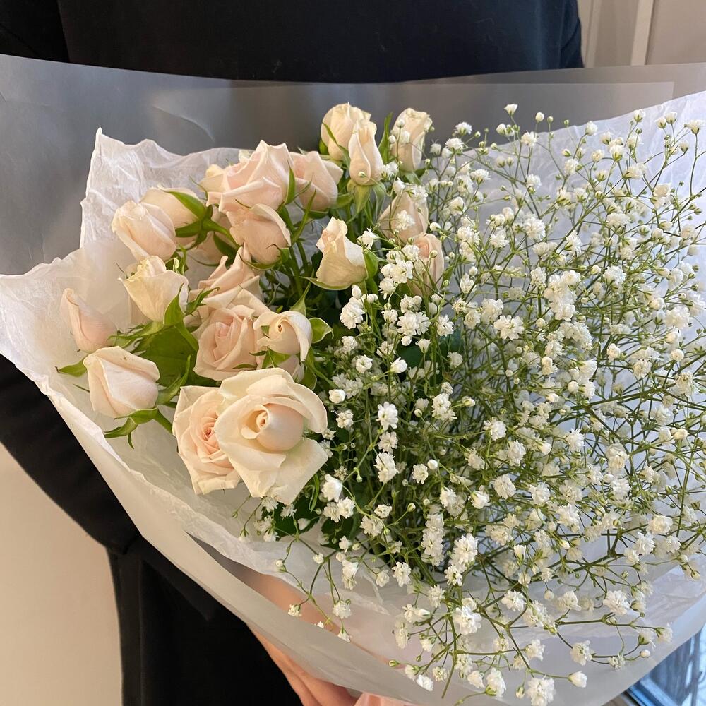 Роза кустовая – 5 шт.гипсофила белая – 6 шт.Тишью – 1 шт.Упаковка дизайнерская – 2 шт.Лента атласная – 1 шт.