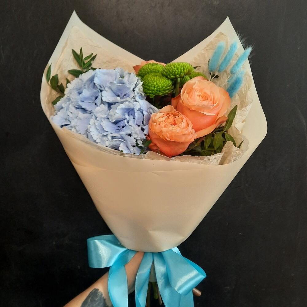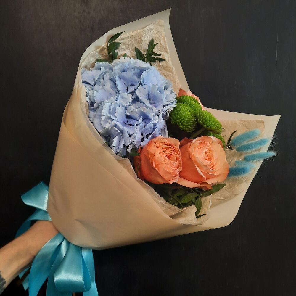 Гортензия – 1 шт.Кустовая хризантема – 1 шт.Роза пионовидная – 3 шт.Фисташка – 1 шт.Лагурус – 5 шт.Упаковка дизайнерская – 1 шт.
