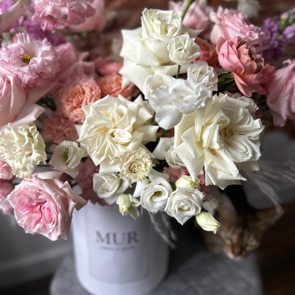 Маттиола – 5 шт.Диантус – 18 шт.Коробка шляпная – 1 шт.Лизиантус Алиса белый – 5 шт.Оазис флористический – 2 шт.Лизиантус алиса пинк – 7 шт.джульетта роза пионовидная – 5 шт.пампасная трава – 5 шт.плая бланка роза – 9 шт.pink o’hara роза – 11 шт.