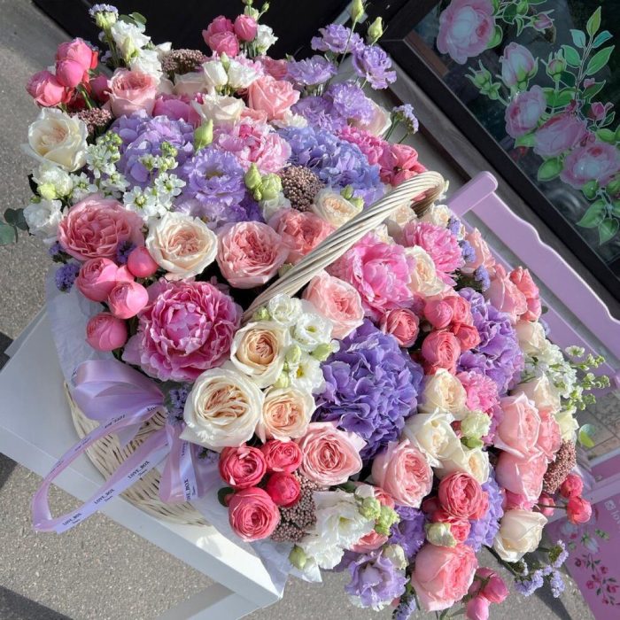 Гортензия – 4 шт.Роза пионовидная – 25 шт.Роза Эквадор – 20 шт.Пион – 10 шт.Роза кустовая – 10 шт.Лизиантус – 15 шт.Статица – 5 шт.Озотамнус – 6 шт.Корзина плетеная – 1 шт.Дизайнерская упаковка – 5 шт.
