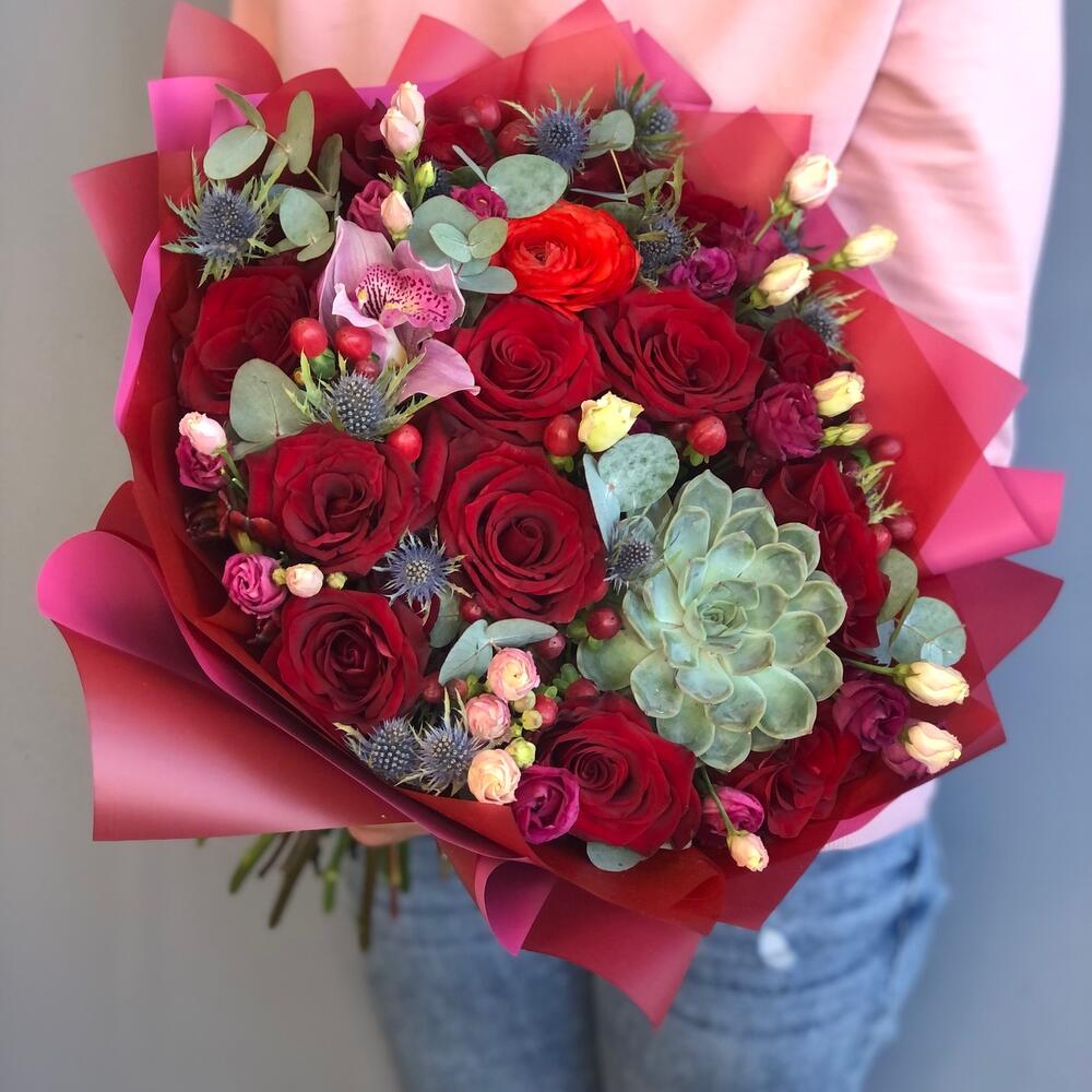 Орхидея Цимбидиум – 1 шт.Эрингиум – 8 шт.Роза – 13 шт.Хиперикум – 5 шт.Суккулент – 1 шт.Упаковка дизайнерская – 2 шт.Лизиантус – 5 шт.Эвкалипт ценерия – 2 шт.Фисташка – 10 шт.