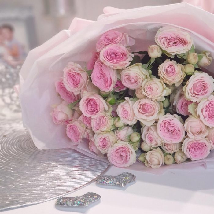 Лента атласная – 1 шт.Роза кустовая пионовидная – 7 шт.Пленка матовая – 1 шт.Открыточка с вашими пожеланиями – 1 шт.Тишью белое – 4 шт.любовь флориста (бесплатно) – 1 шт.