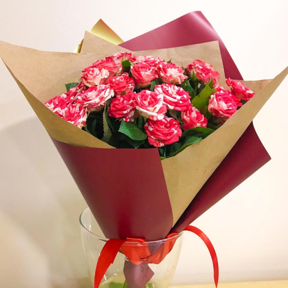 Роза кустовая – 7 шт.Лента атласная – 2 шт.Матовая пленка – 2 шт.