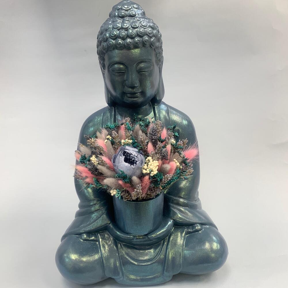 кашпо гипсовое будда – 1 шт.лагурус микс – 50 шт.Роза стабилизированная – 1 шт.Лаванда (сухоцвет) – 40 гр.Озотамнус – 1 шт.Лимониум – 1 шт.