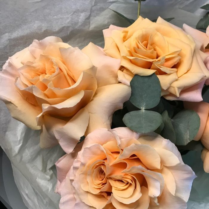 Лента – 1 шт.Эвкалипт – 2 шт.Тишью – 2 шт.Французская роза – 5 шт.Пленка матовая – 1 шт.Средство для продления жизни цветов – 1 шт.