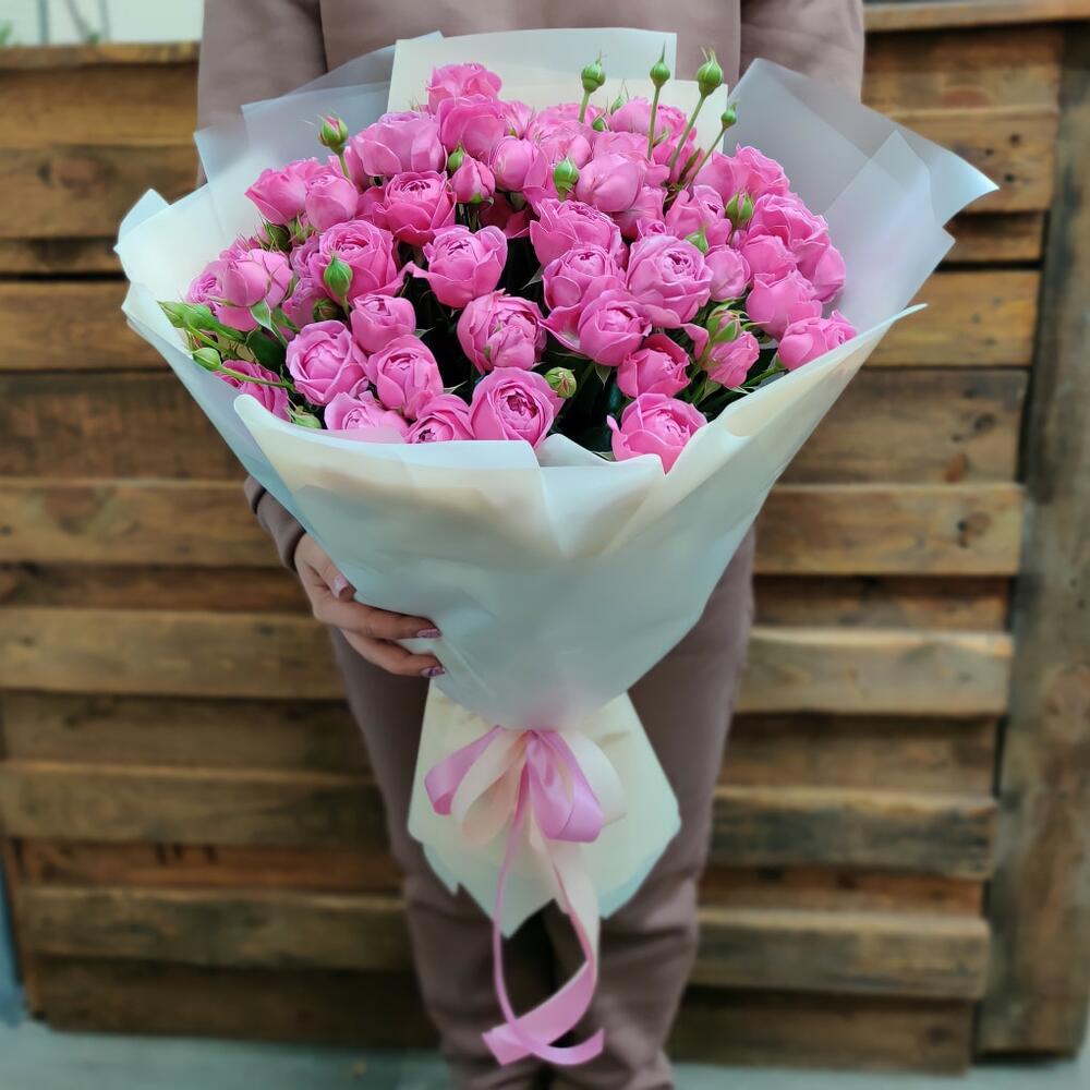 Лента – 1 шт. Пионовидная роза – 15 шт. современнаяя упаковка – 1 шт.