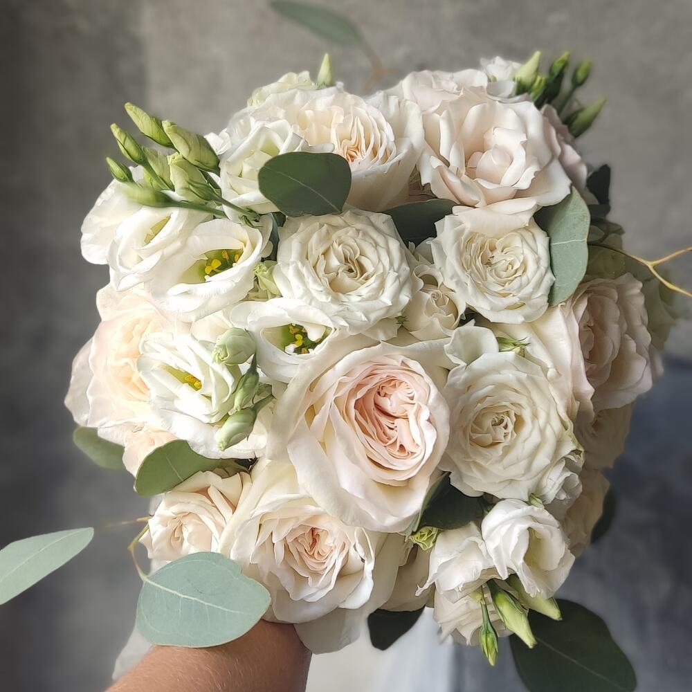 Лизиантус – 5 шт.Роза кустовая – 5 шт.Эвкалипт – 2 шт.Роза одноголовая – 5 шт.Лента атласная – 1 шт.