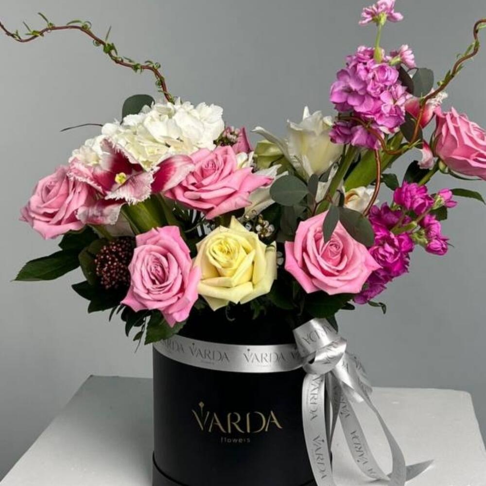розы – 9 шт. Гортензия – 1 шт. Маттиола – 2 шт. Лилия – 1 шт. Эвкалипт – 1 шт. Скиммия – 1 шт. Салекс – 2 шт. Тюльпан – 1 шт. Ваксфлауэр – 1 шт.
